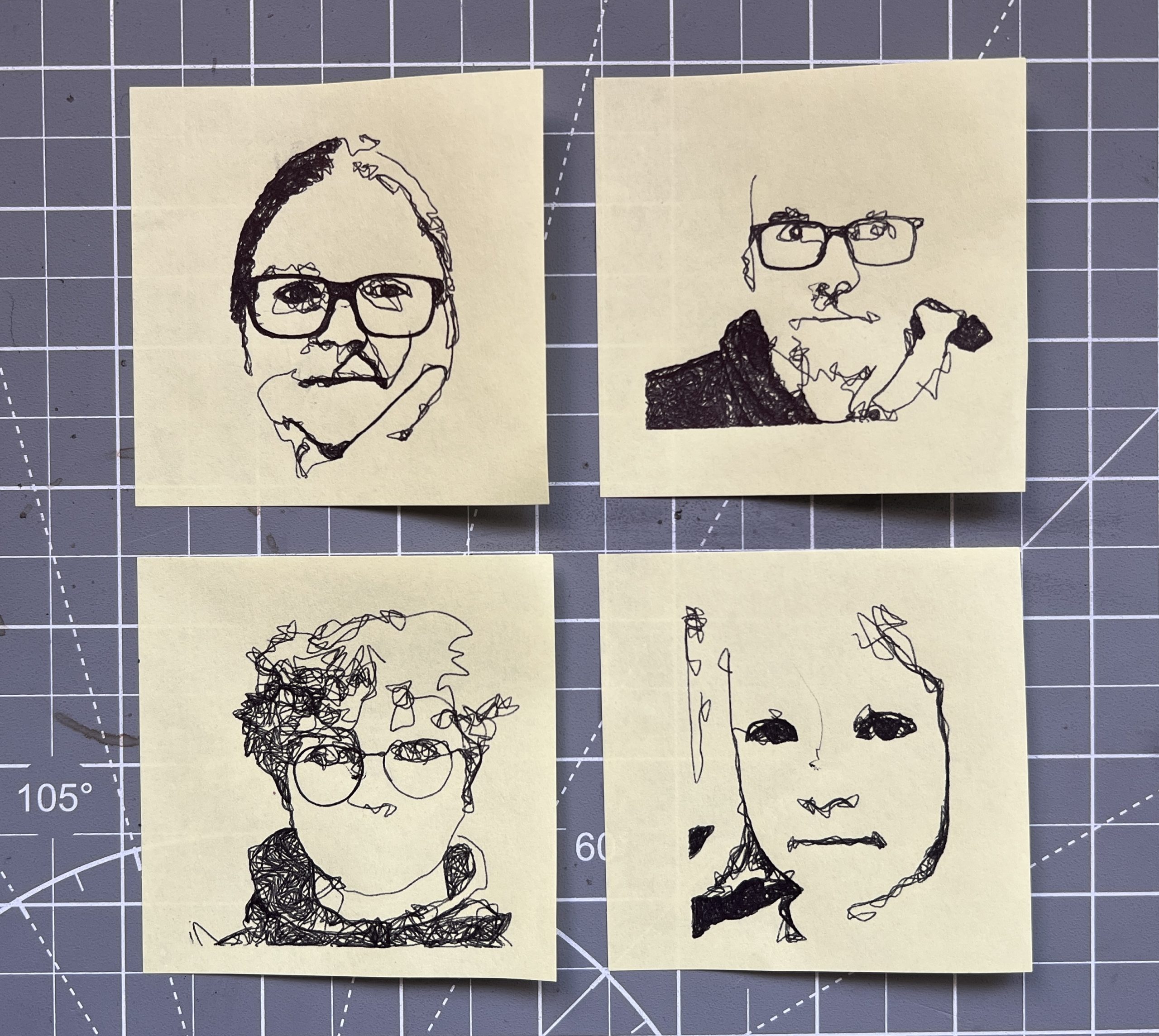 People were clearly keen on getting a tangible souvenir from the evening. Having a robot draw their portraits on a Post-it note struck a chord hard. I think what I’ve learned from this event is that while the lasers throw a lot of pazzazz at you, they are more complex machines that most people don’t try to engage with beyond taking in the light show. While a pen based machine is doing the same thing you’d do with your hand so it’s more approachable to be curious about. As usual a small fraction of them were fixated beyond reason on watching the machine at work. There has to be a “drawing automaton obsession” gene present in ~10% of the population.